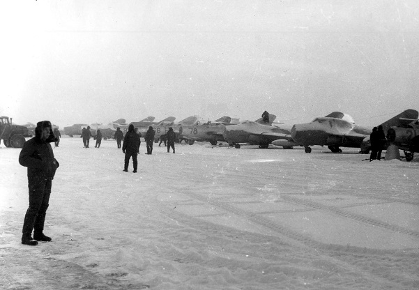 Начали летать, вспомнили, вроде, как «за ручку держаться», только за фонарём обстановка непривычная. Зима, вокруг всё белым бело, речки и поля укрыты снегом, на карте всё иначе. Ведь рисуем снова штурману район полётов. Учим по карте все населённые пункты, речки. А в действительности очертания населённых пунктов размыты, речек толком и не видать. Потихоньку освоились со спаркой, потом и с «боевым», - МиГ-17. Мороки зимой на полётах побольше, - и просто холодно, и со снегом бороться приходится. Благо, снег временами таял совсем и не оставалось даже следов, но вскоре появлялся новый. Хоть и без снега, но было холодно, правда, у нас была соответствующая экипировка.Хоть и бэушные, но тёплые куртки, демисезонные «ползунки» и меховые сапоги. Так, что, на улице мы не мёрзли.