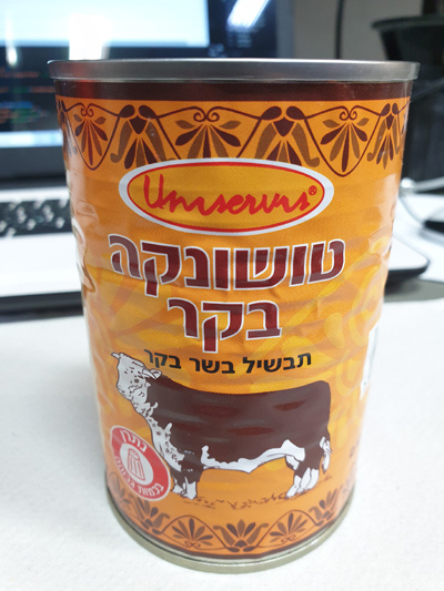 Говядина тушёная кусковая "uniservis". В простонародье тушёнка. Была куплена в магазине "Кешет таамим" в августе 2020 года. Стоимость 22,90 шек.