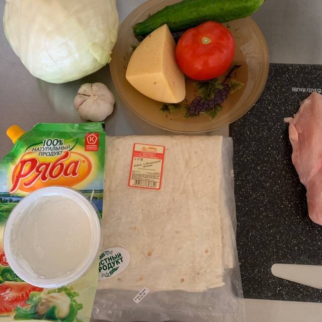 Как только курица будет готова, выключаем плиту, и оставляем остывать. Тем временем режем овощи. Капусту режем как можно мельче. Помидоры и огурцы лучше нарезать, также как и курицу, слайсами. Остывшую курицу нарезаем помельче. Натираем сыр. Вообще, сыр не входит в состав классической шаурмы, но я сыр очень люблю, поэтому решила добавить и его.