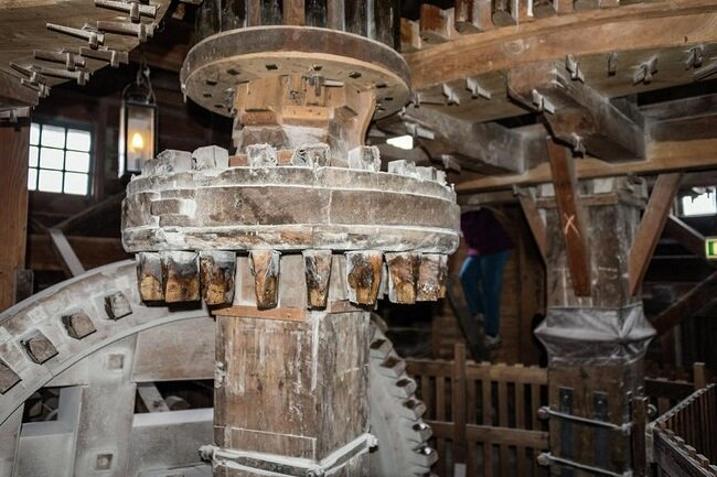 - Во-вторых, нужно предусмотреть маршрут экскурсии, чтобы туристы могли одновременно посмотреть все уровни мельницы, побывать на смотровой площадке и при этом не препятствовать производственному процессу. И также вес слоняющейся по этажам группы, из минимум, как пятнадцати человек, нужно было также учесть. Дело в том, что от потолка до пола мельницы проходит главный вал, перекос которого допускать нельзя.