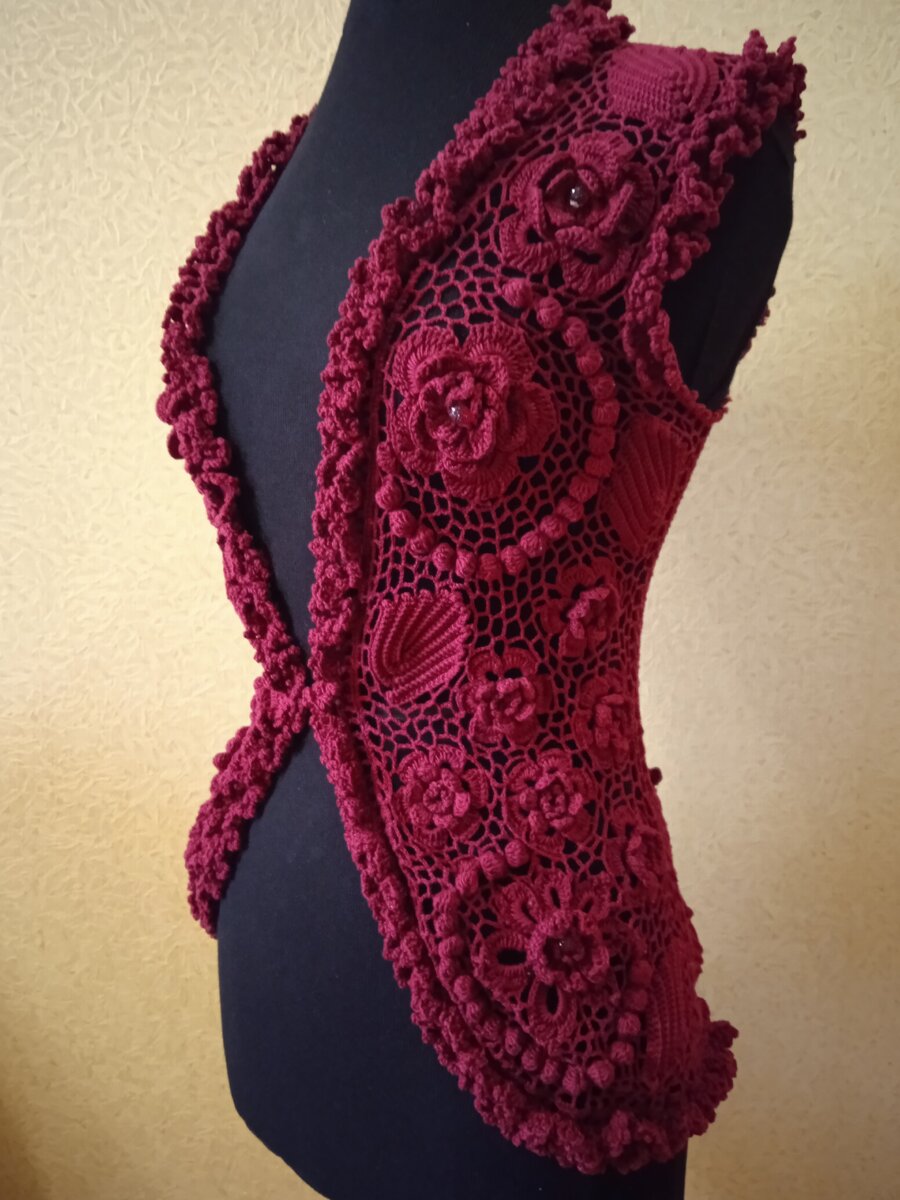 Сегодня я расскажу вам о жилете вишнёвого цвета, связанного в стиле ирландское кружево. Выбрала вариант жилета, так как просто захотелось иметь в своём гардеробе вещь, которая бы прекрасно смотрелась в сочетании с различными кофтами, блузками, водолазками, конечно при соблюдении сочетания цветов.
