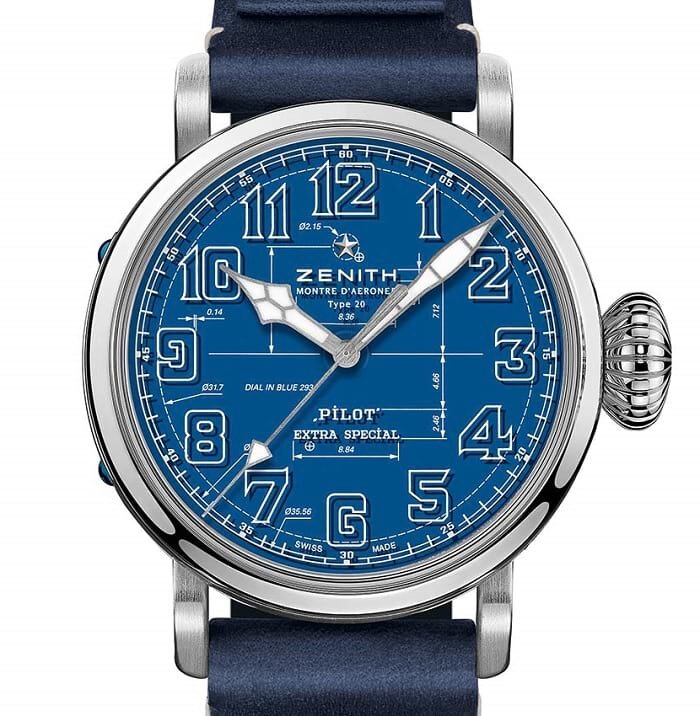 Часы Zenith Pilot Type 20 Blueprint (Ref. 03.2435.679/51.I012) комплектуются синим ремешком из телячьей кожи и титановой пряжкой. Розничная цена 8 300 Евро.