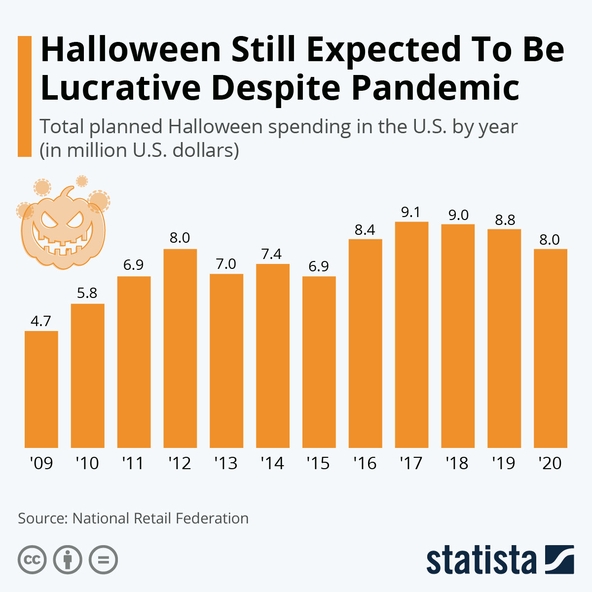 Интересно, что с 2009 расходы на празднование дня всех святых выросли почти в два раза: с 4.7 миллиарда 11 лет назад до рекордных 9.1 миллиардов в 2017, после чего более-менее стабилизировались. И было бы логично увидеть сейчас снижение к цифрам предыдущего кризиса (а то и ниже - сейчас не просто кризис, но и пандемия и социальное дистанцирование), но этого не случилось.