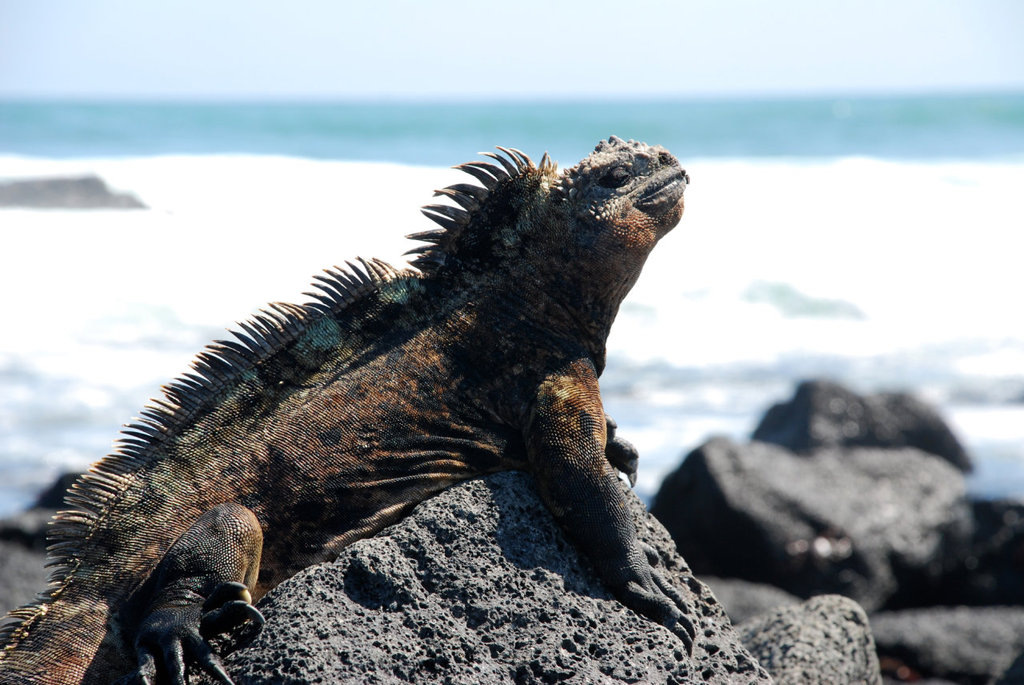 А вот и аборигены острова — непуганые морские игуаны, для которых Галапагосы стали единственным местом на Земле, приютившим их. Подставив мордочки слепящему солнцу, они картинно замерли в застывших позах на застывшей лаве. Одна, явно не в духе, посмотрев одним глазом в нашу сторону, начала яростно плеваться. Недоразумение быстро рассеялось. Таким неприличным способом игуаны освобождаются от морской соли, попавшей во время длительных морских купаний. А находиться под водой игуана может около часа, питаясь тихоокеанскими водорослями. Впрочем, на архипелаге обитает и другой вид игуан – сухопутный. В своем отнюдь не разнообразном меню эти страшилки специализируются на обгрызании произрастающих здесь кактусов, пребывая, вероятно, в постоянном кайфе.