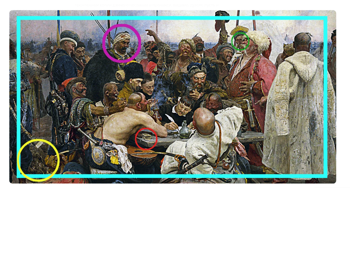 Слева за столом с пронзительным и серьезным взглядом на весь этот шабаш взирает откровенный москаль. Репин, скорее всего, показал, что только под крылом мощной и развитой Российской Империи и обеспечивается в сечи относительная безопасность и возможность казакам под выпивку соревноваться в штуках над все еще грозными османами. А без России все могло быть совершенно иначе.