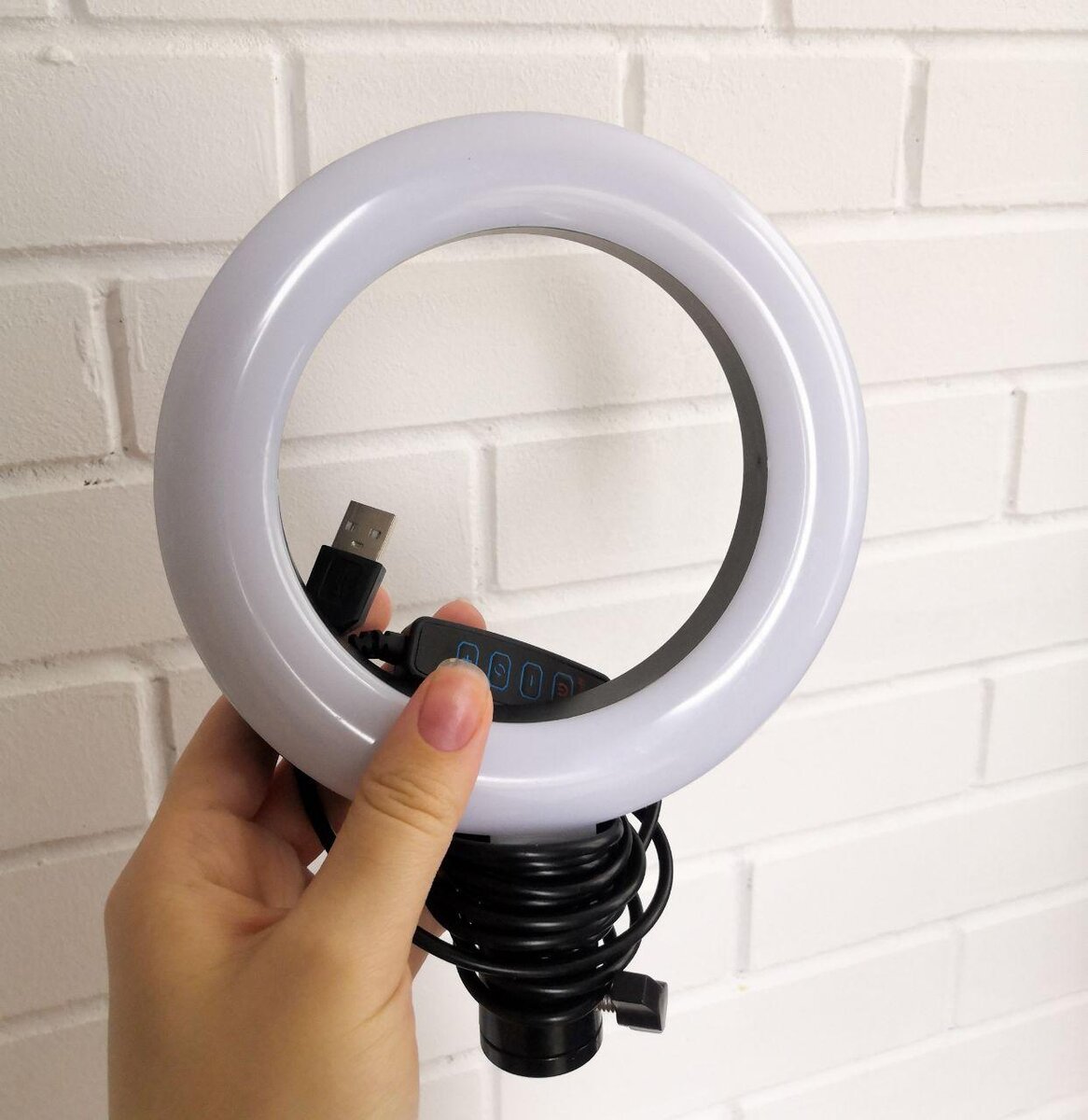 У него есть 3 режима температуры света и несколько режимов яркости. Работает он от USB, можно подключить к компьютеру, к power-bank'у и напрямую к сети через адаптер для розетки. На мой взгляд, это самый удобный способ подключения для кольцевого света, так как у тебя нет постоянной зависимости от одной лишь розетки. Небольшой размер такого кольца и минус и плюс. Минус из-за того, что для портретной съемки его очень мало, а плюс такого размера в том, что для детальной съемки лица (глаз, бровь) оно идеально, так как подсвечивает только нужную зону.