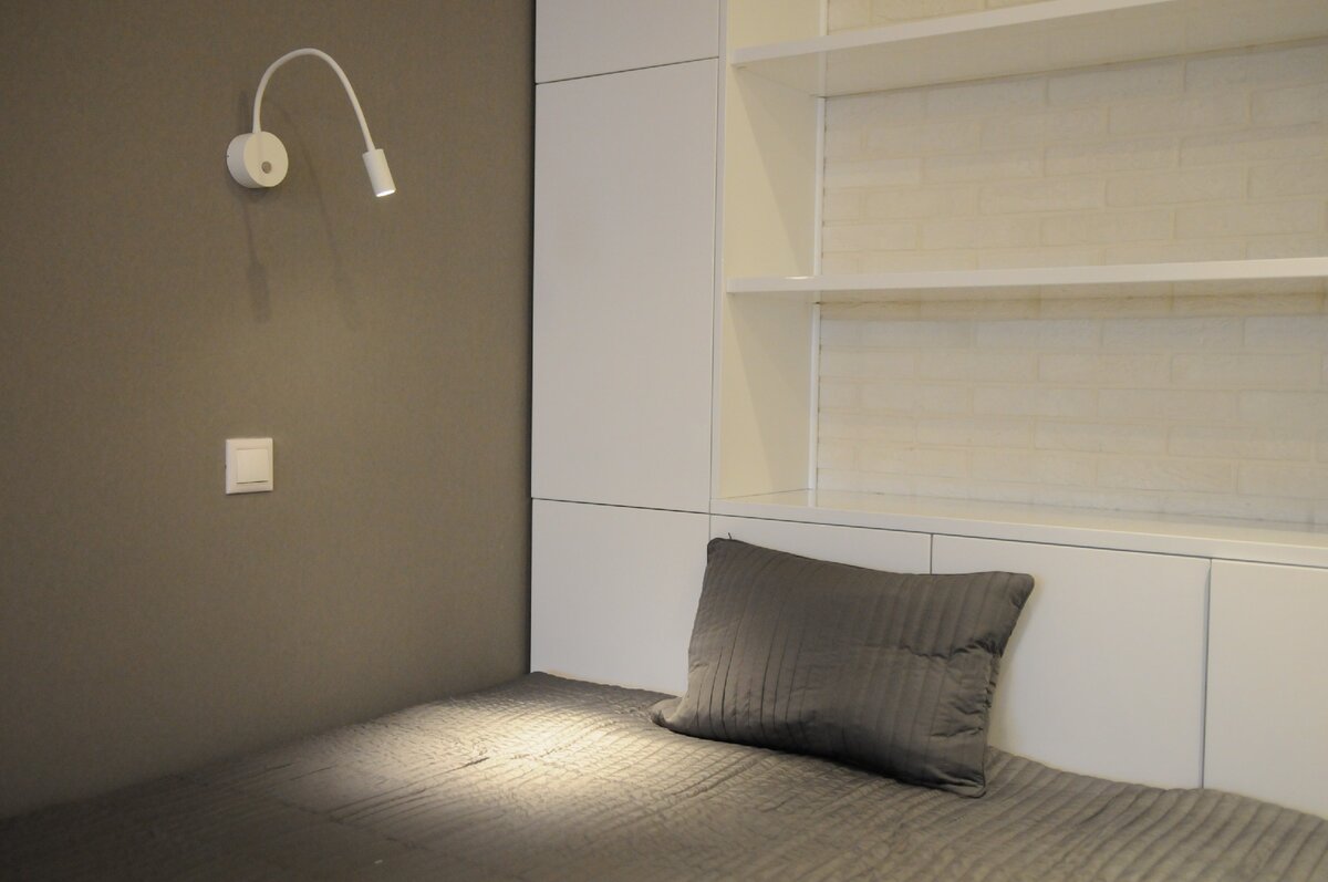 Это место можно и нужно использовать! Закажите вместительные прикроватные тумбочки или шкафы для самого потолка – это позволит полностью решить проблему хранения. В крайнем случае можно повесить над кроватью несколько полок, и у многих вещей появится свой дом.