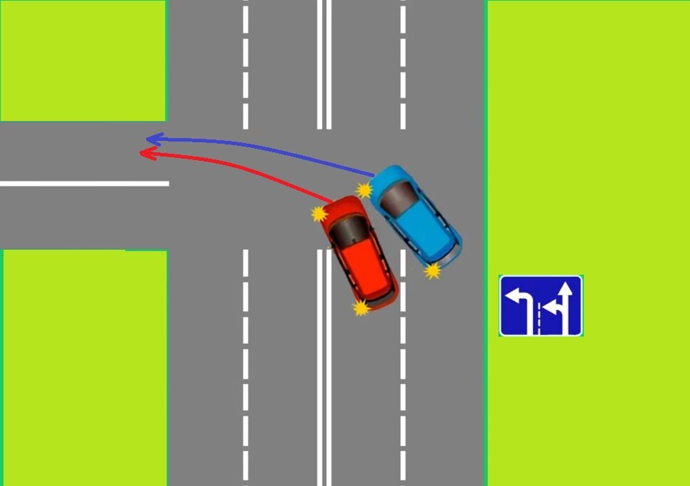 Достаточно спорная ситуация если поворот налево осуществляется из двух полос в одну, сложно разобраться, кто имеет преимущество в движении. По данному поводу очень много мнений, множество экспертов высказываются по разному по данному поводу. Данный случай нужно просто конкретизировать более подробно.
