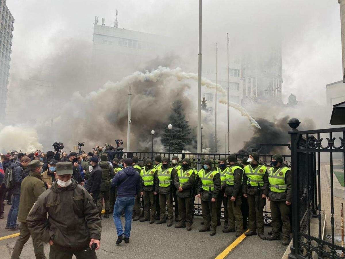 Недовольные происходящим протестующие по традиции запалили дымовые шашки и файеры, забросав ими двор