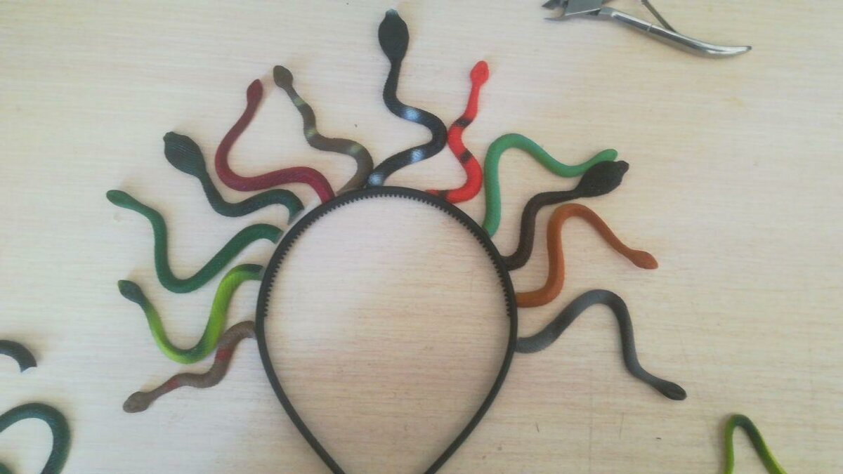 Выбрала я именно образ Медузы Горгоны, так как это мой любимый персонаж греческой мифологии. Главная отличительная черта этого персонажа - змеи вместо волос. Я интерпретировала это по-своему и решила сделать корону в виде змей. Делала я её ещё в мае. Купила в отделе с игрушками набор змеек и черный ободок. Змеи я разрезала и примерила к ободку: