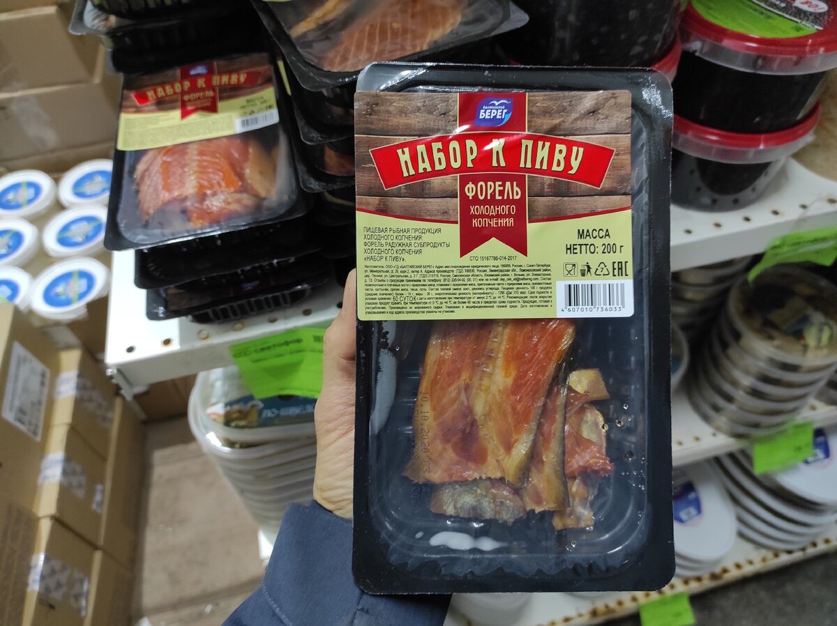 Приветствую Вас, уважаемые читатели моего канала! В магазине "Светофор", уже продолжительное время имеется в продаже форель холодного копчения, в хорошо закрытой упаковке. Свиду непонятно, сколько кусочков рыбы находится в упаковке и я решил купить одну упаковку, чтобы посмотреть сколько кусочков форели положил производитель и какие части рыбы заложены внутрь. Цена, по моему мнению, вполне приемлемая для такого набора и составляет всего 66 рублей за 200 грамм копченой форели. Дома, перед тем как распечатать упаковку, я посмотрел состав и там было написано, что в состав этого набора входят срезки с приголовных частей рыбы, а также хвостовые части, плавники. То есть в набор продукта входят не куски полноценной рыбы, а лишь как я понял, кости с минимальным содержанием мяса. Тот факт, что в составе не полноценные куски форели меня немного спустил с небес на землю, но я решил все таки открыть упаковку и посмотреть, а есть ли что - нибудь внутри съедобное)). Открываем упаковку и видим сверху