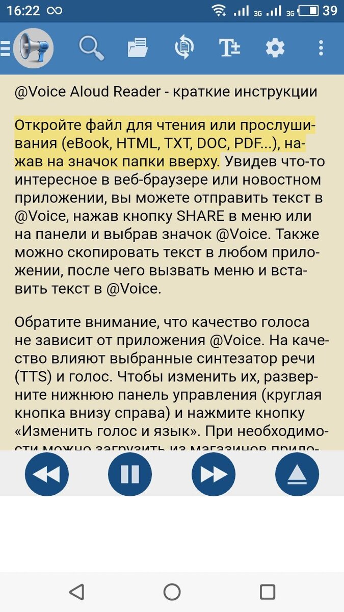 Аудиокниги становятся всё популярнее, но далеко не у всех обычных, текстовых книг есть такие удобные версии. Чтобы прослушать любую электронную книгу при помощи синтезатора речи, нам понадобится смартфон на Android и приложение @Voice Aloud Reader Устанавливаем @Voice Aloud Reader с PlayMarket. Открываем и видим окно с ознакомительным текстом Для того, чтобы открыть текстовый файл, нажимаем на значок папки вверху, как показано на фото Приложение найдёт все текстовые файлы на вашем устройстве, и отсортирует по основным форматам Если голос, установленный по умолчанию, вас не устроит (скорее всего), всегда можно зайти в меню быстрых настроек, нажав на кнопку с треугольником внизу справа, и перейти в пункт "Изменить голос/язык" Здесь можно выбрать варианты голосов. Если есть стабильное подключение через Wi-Fi или безлимитный тариф, лучше сразу поставить галочку напротив "Также показывать голоса, требующие сетевого подключения" Такие голоса, с пометкой network, звучат качественнее. Выб