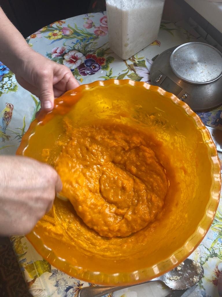 После того, как пирог приготовился нам нужно залить верх тыквенным пюре.