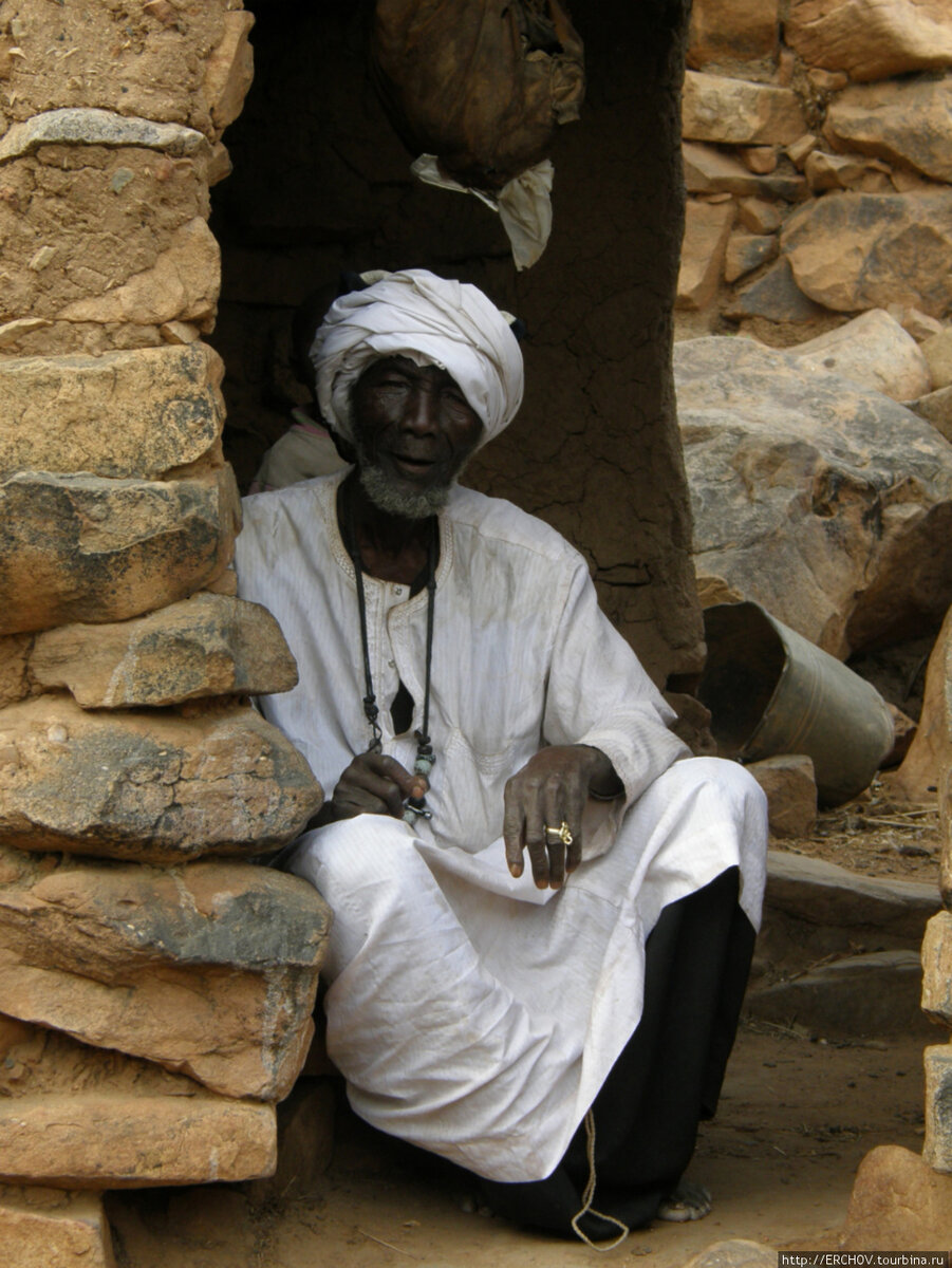 Действие перешло некие рамки приличия, психиатр, как гость, вёл себя крайне бестактно, но верховный Вольдемару ничего не ответил. На следующий день, когда группа ехала через горы на автобусе, впереди, на глазах у всех, аккурат в 17 часов перевернулся грузовик. Люди зароптали, кто-то даже предложил высадить из автобуса Вольдемара, который сразу притих. Но с другой стороны, если каждая африканская команда имеет колдуна, почему они не Чемпионы Мира? Если существуют китайские церемонии, то не уступают им и колдовские догонские. Жена ведуна придя к колодцу, должна обязательно три раза сказать, кому она понесёт воду. Женщины услышав, пропустят её вперёд, сразу после неё воду брать нельзя, нужно подождать. Веками отработанны церемонии при походе его жены за просо, за зерном, за сукном… Колдун может и должен гулять по деревне, но в его дом заходить нельзя. При встрече на улице необходимо отвернуться и пропустить старика. Давать ему и брать от него, что-либо нельзя, нужно положить на землю, совершать это должен специальный человек. Нельзя и общаться напрямую, только через этого посредника. Одним словом, полно всяких прибабасов. Даём посреднику денежку, и он кладёт кадо возле колдуна. Исчезает напускная суровость, дед расплывается в улыбке. Фотографируем старика, а он желает нам хорошей дороги. Тут из дома выскакивает внучок. Ребёнок явно отличается в лучшую сторону от своих сверстников культурой поведения. Он более воспитан, видна ухоженность и лучший достаток. Я отдаю посреднику для колдунёнка игрушку – надувной язычок. Дед от радости просто сияет. Удивительно, но больше чем родной чёрной магии, африканцы боятся белой магии. Если после нашего визита кто-то как-то не так себя почувствует, колдуна будут просить провести обряд очищения деревни. Юга вплотную подходит к постройкам теллемов, ранее в них жили и сами догоны. Здесь живёт огон.