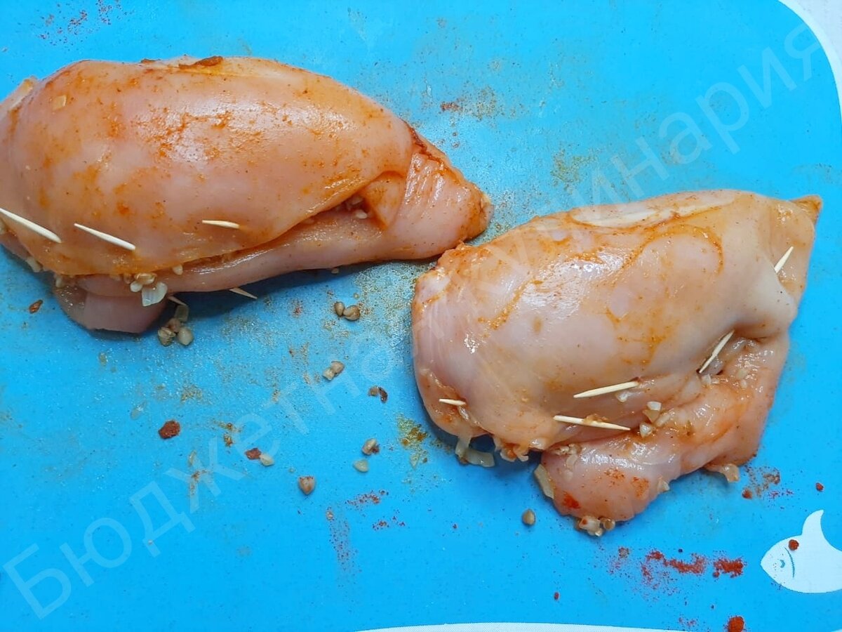 После этого мы скрепляем кармашки зубочистками и натираем наружную часть приправами.