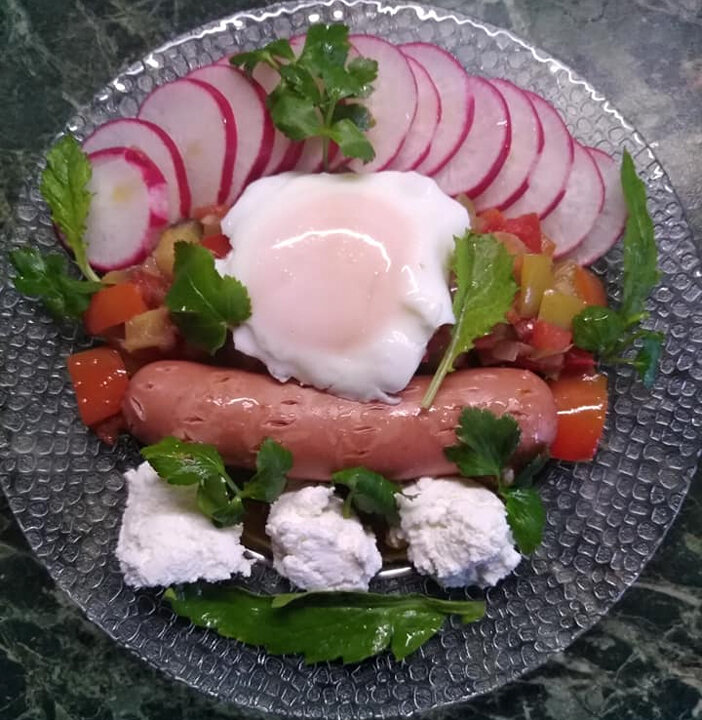 Овощное рагу с добавлением корня имбиря, диетическая сосиска, творог, яйцо, овощи сырые, чеснок и зелень обязательно.