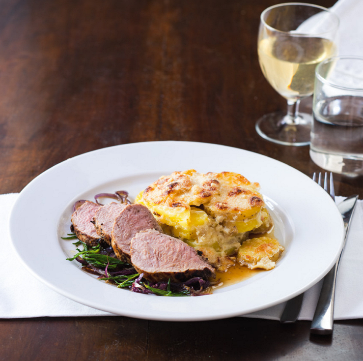 - Приготовьте запеченный картофель следующим образом. Очищенный, промытый картофель нужно нарезать на сантиметровые ломтики, и выложить в смазанную маслом форму для запекания, обязательно посолить каждый слой и залить разогретыми сливками с чесноком, посыпать пармезаном и запекать при 180 ° C около 30 минут.