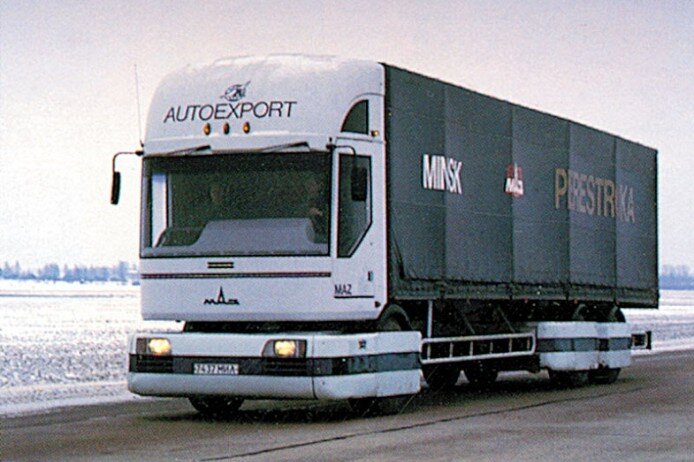 Так вот в Минске предложили отказаться от привычной схемы: инженеры решили использовать иную конструкцию. Передняя тележка с одной осью и кабиной являлась тягачом, к ней крепился прицеп, у которого было три оси. Саму длину прицепа можно было регулировать, то есть фура становилась на треть длиннее обычного автопоезда. Седельный тягач, который уменьшает длину прицепа, ведь отсутствовал – получалась такая цельная гусеница, которая могла перевозить до 80-ти тонн.