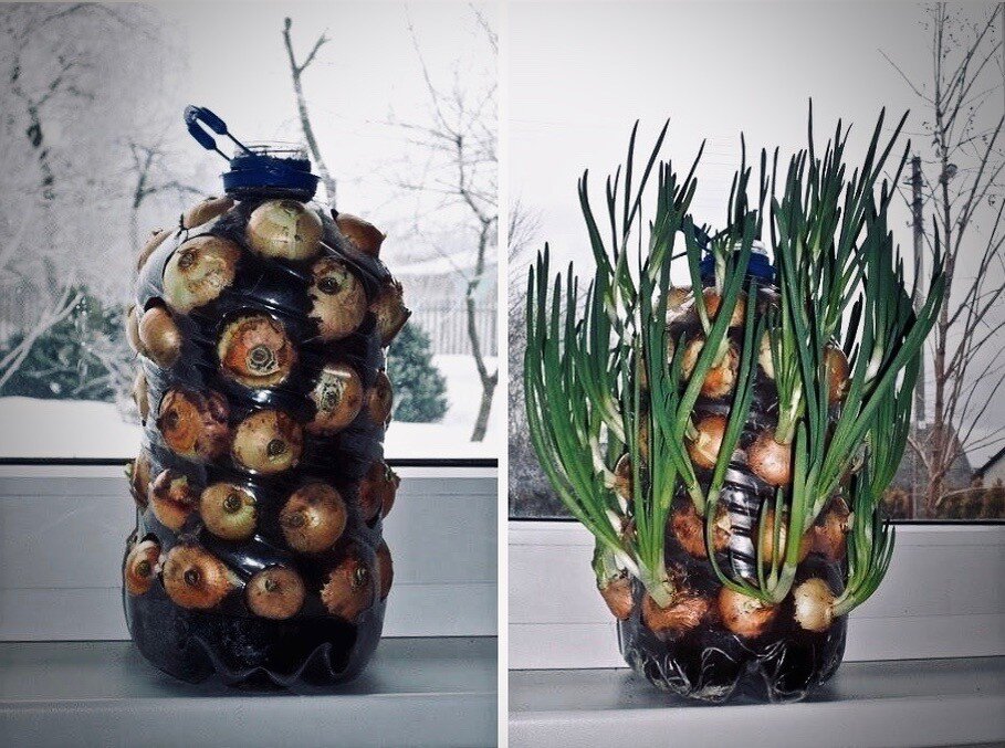 Если мало места на подоконнике, а хочется завести грядку, потребляете лука много, можно использовать обычный 5-6 литровый пластмассовый бутыль. Вот на фотографии.