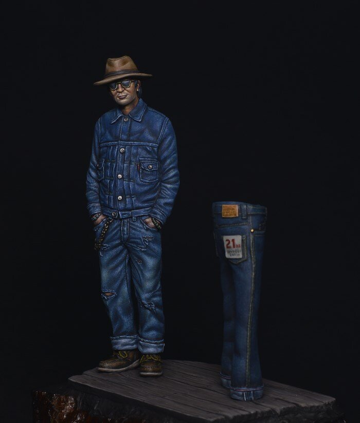 Denimhead Как то "случайно" :-) слепилась фигурка денимхеда.Посвящается всем любителям Настоящих джинс из selveage denim. Продаётся под маркой моего проекта исторической и фентези миниатюры Tartar Miniatures (Italy)Фигурка выпускается в смоле(требует сборки), 75мм по линию глаз. На бокс-арт красил Константин Пинаев.