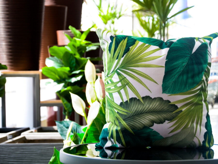 Остался последний штрих – чтобы полностью перенестись в тропики, добавьте к интерьерному декору кашпо и горшки с экзотическими растениями с яркими крупными листьями. Пусть это будут фикусы, драцены, монстеры, цветущие орхидеи. Живые растения – это возможность прикоснуться к тропикам и вдохнуть аромат цветов.