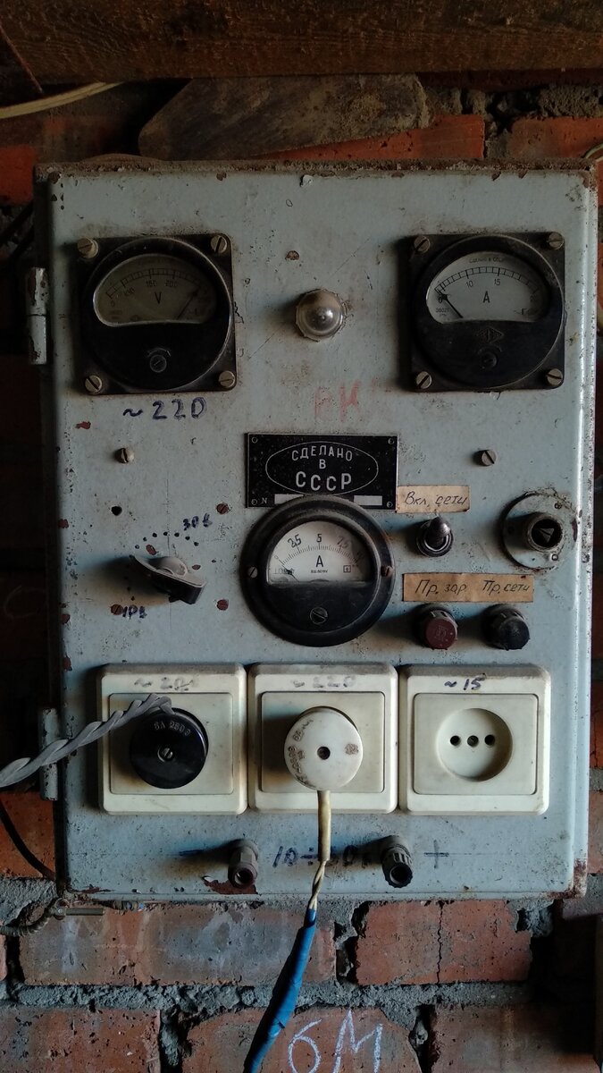 Эта штука висит на стене и напоминает лицо с глазами, носом и ртом. Посередине красуется эпичная табличка "Сделано в СССР". Судя по "глазам", то они собрались в кучу. На самом деле это старинный блок питания и зарядное устройство. Подаваемое напряжение можно регулировать. Скорее всего, внутри находится множество трансформаторов.