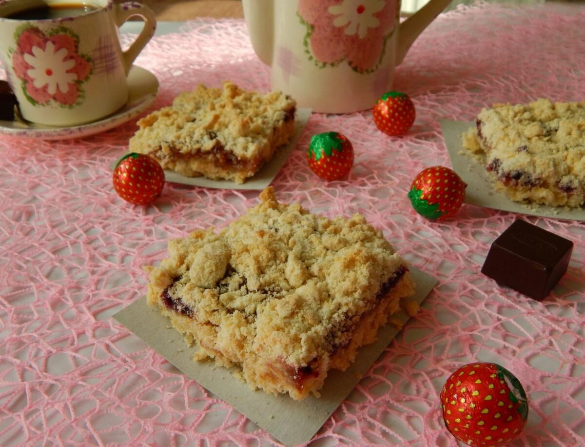 Высыпаем 2/3 части теста в смазанную маслом форму. Сверху кладем чайной ложкой варенье (лучше брать его не очень жидкое, но и не совсем густое, иначе пирог будет слишком сухой, нужно чтобы тесто немного пропиталось жидкостью из варенья). Остатками теста засыпаем варенье. И выпекаем такой пирог 20 минут при температуре 180 градусов.