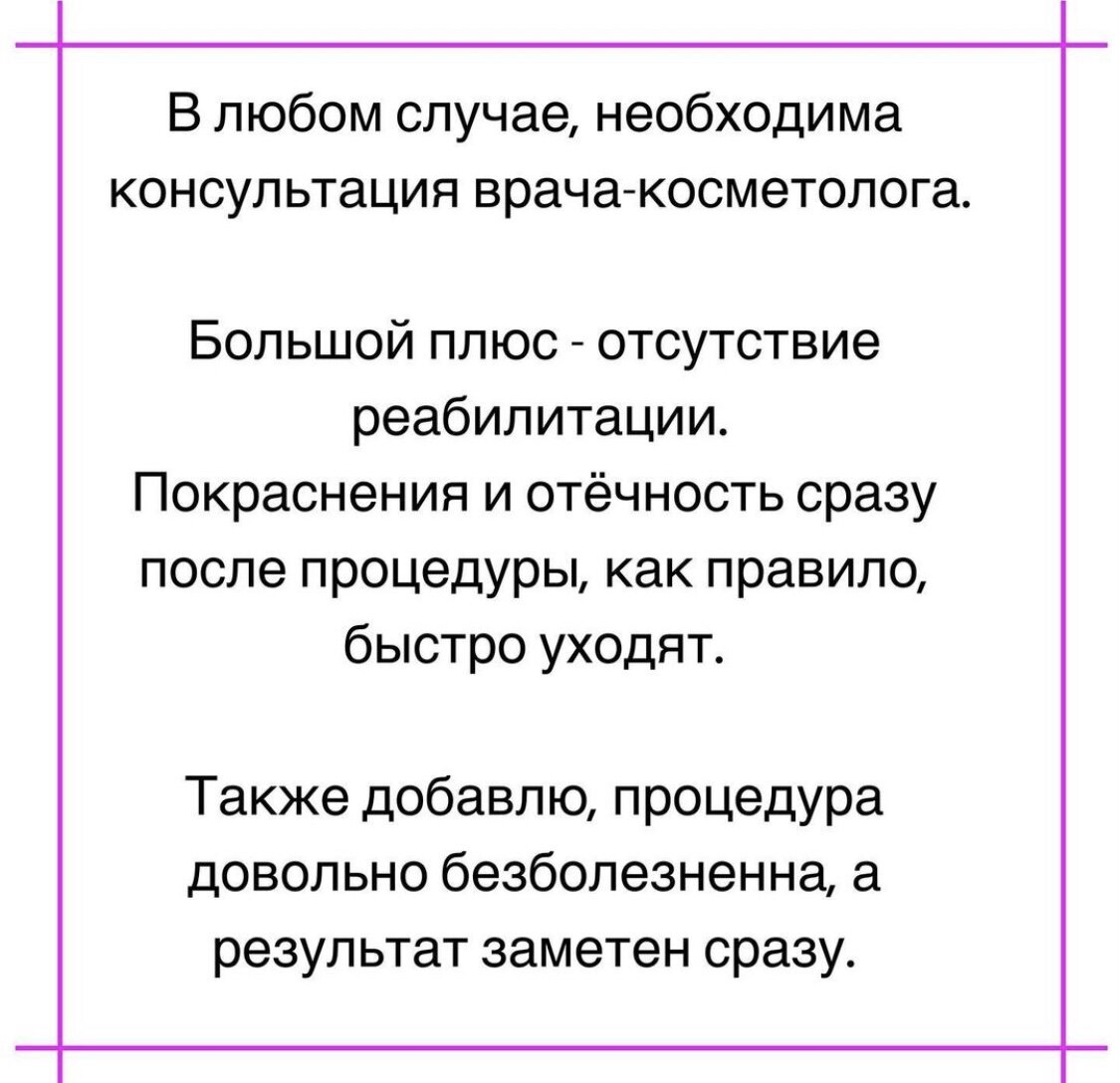 Сразу отмечу, эта процедура поможет вам скорректировать небольшие дефекты и визуально улучшить внешний вид. Но не стоит думать, что она является альтернативой пластической операции. Если требуются радикальные изменения, либо исправление дыхательных проблем - здесь поможет исключительно пластической хирург, даже если ваш косметолог уверяет в обратном.