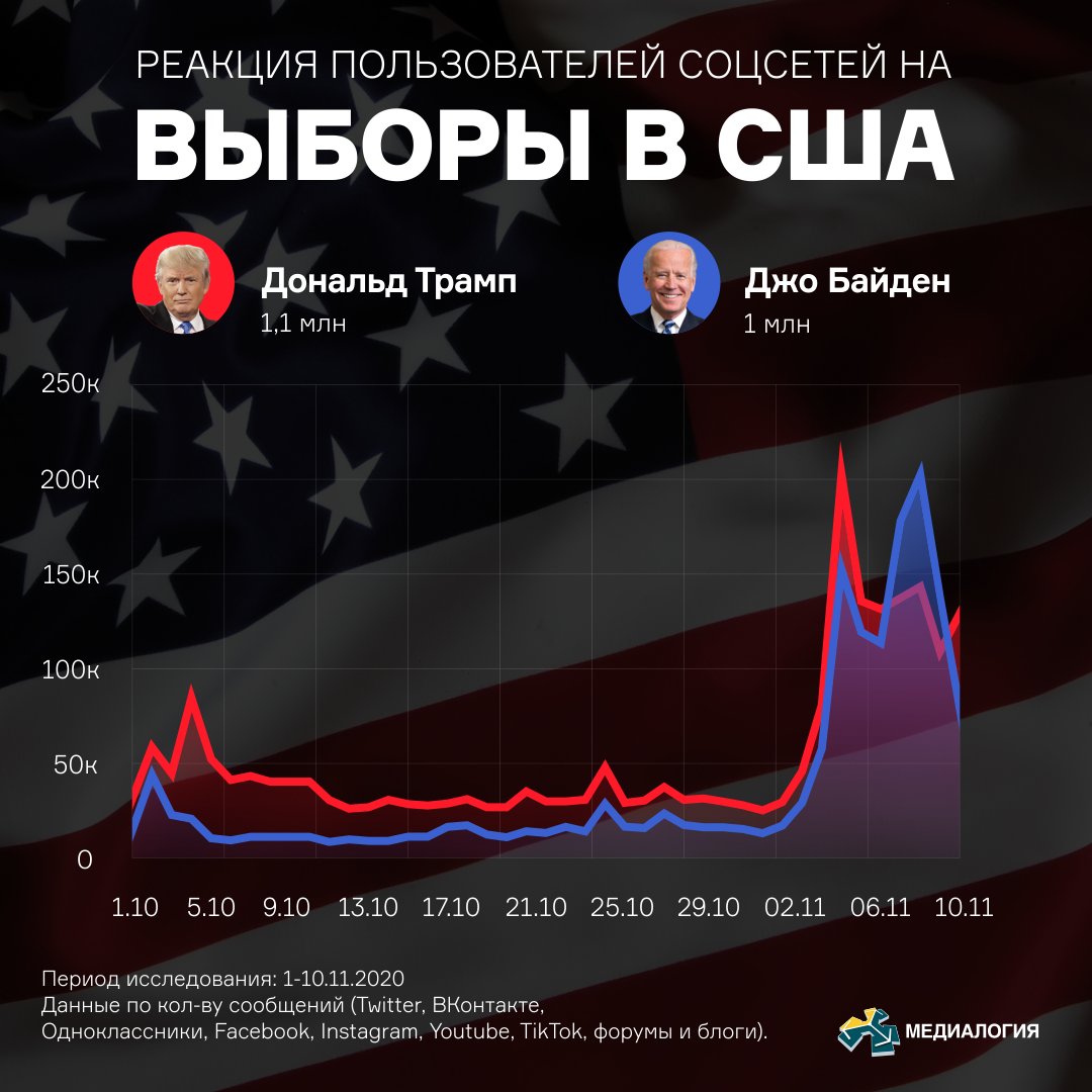 Используя систему для SMM, проанализировали реакцию российских пользователей соцсетей на события, связанные с выборами в США. Всего в период с 1 по 10 ноября было зарегистрировано более 2,1 млн сообщений.