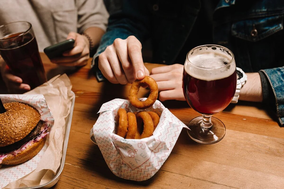 · Еда, которую обычно заказывают к выпивке. В маленькой пачке чипсов содержится больше калорий, чем в полулитровой кружке напитка: 85 гр хрустящей картошки ровно в два раза «весомей» бутылочки лагера, 200 граммов свиного шашлыка — в три. Эта же бутылка объемом 0,5 эквивалентна паре столовых ложек майонеза в вашем салате.