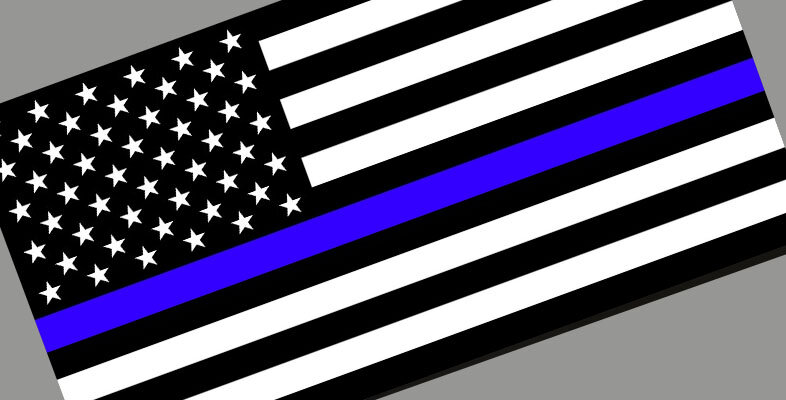 Это т.н. мемориальный флаг - его можно использовать дабы отдать дань уважения погибшим на службе, при исполнении. Флаг с синей полоской используется как флаг памяти о погибших в борьбе с преступностью полицейских (синий цвет - основной цвет униформы полиции).