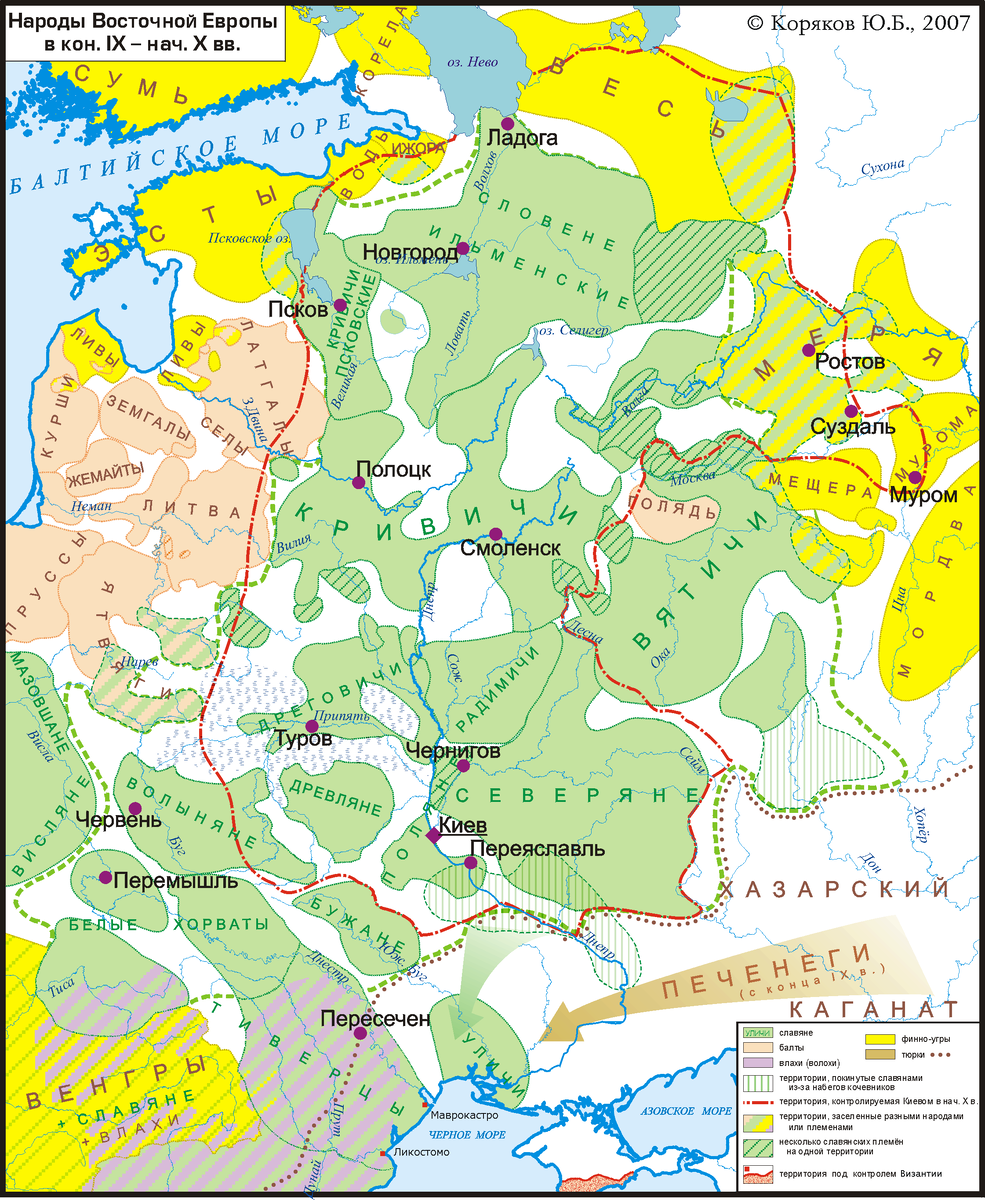 Но говоры были не совсем различны, у них имелись и общие черты (полногласие и т.п.). Возможно, эти общие черты появились по причине общего происхождения восточных славян. Но вряд ли они расселялись на больших территориях, вошедших затем в древнерусскую державу, из одного центра. Хотя, возможно, значительная часть расселилась из общего центра - где мог существовать относительно единый язык; затем он оказал влияние и на остальных.