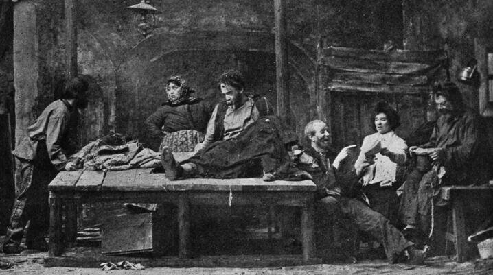 Подвал, похожий на пещеру. В правом углу отгорожена комната Пепла, около двери в эту комнату находятся нары Бубнова. В левом углу — большая русская печь. На кухне живут Квашня, Барон, Настя. У левой стены сидит Клещ, примеривая ключи к старым замкам. Посередине находится большой стол, две скамьи, табурет. За столом хозяйничает Квашня, Барон жует хлеб, Настя читает книгу. На постели, за пологом, кашляет Анна. Бубнов на нарах примеряет на болванке для шапок старые брюки. Сатин только что проснулся и рычит. На печке кашляет Актер.