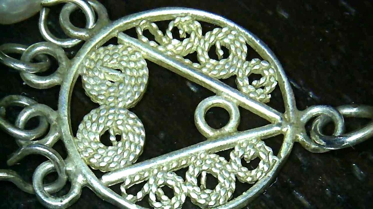 То ли дело - крепление. Вот где настоящая красота! (а заодно и парочка дополнительных, очень красивых фотографий перламутровых висюлек. Судя по всему, не натуральный камень, а что-то очень странные пузырьки и вкрапления)