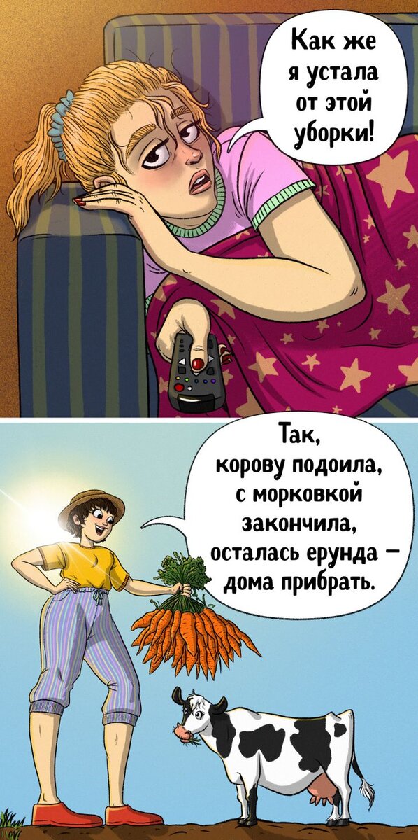 В комиксах верхняя картинка показывает жизнь мегаполиса, а нижняя — быт села или небольшого городка. Удастся ли вам узнать в героях этих иллюстраций себя, своих знакомых или д-а-а-альнюю родню.