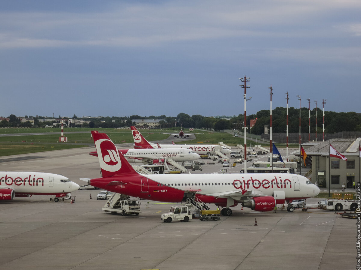 AirBerlin был базовым перевозчиком аэропорта Берлин-Тегель. Авиакомпания была образована в 1978 году и являлась вторым перевозчиком Германии с флотом из более чем 130 самолётов и более 100 направлениями полётов. Исповедовала концепцию "почти лоукостера". В отличии от последних бесплатно кормила чем-то вроде сэндвичей в полёте, раздавала шоколадки, на дальнемагистральных рейсах имела бизнес-класс. Но в 2017 году она обанкротилась. А ведь новый аэропорт Берлина строился как её будущий дом...