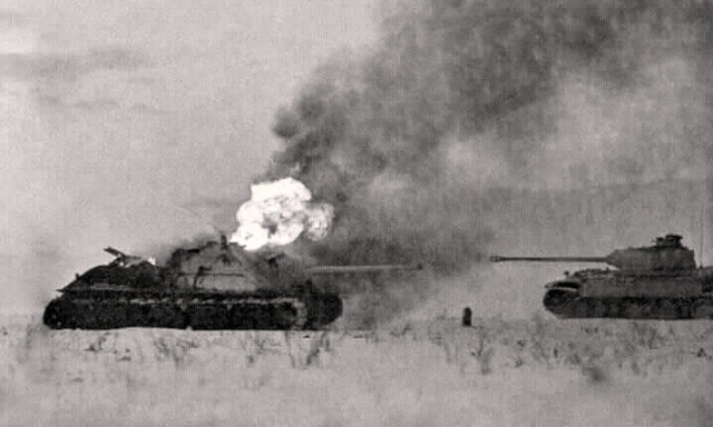 Но дальше произошло то, чего никто не ждал. Из-за хаты влетела пылающая самоходка и рванула к ближайшему Тигру. Тот не успел перезарядить пушку и попятился.