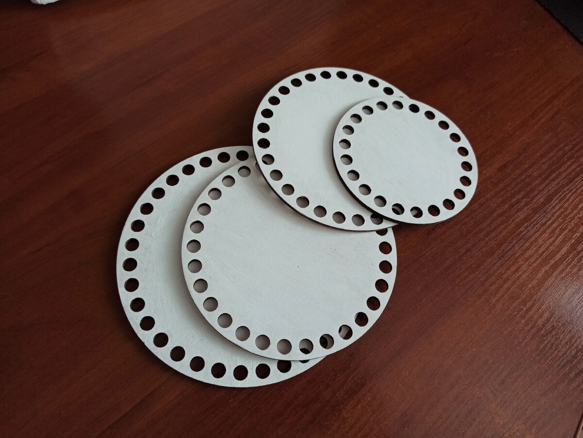 Для первой партии я взяла 4 заготовки: 10 см, 15 см и две по 13 см. Традиционно сначала покрыла грунтом в 2 слоя, затем белой акриловой краской.