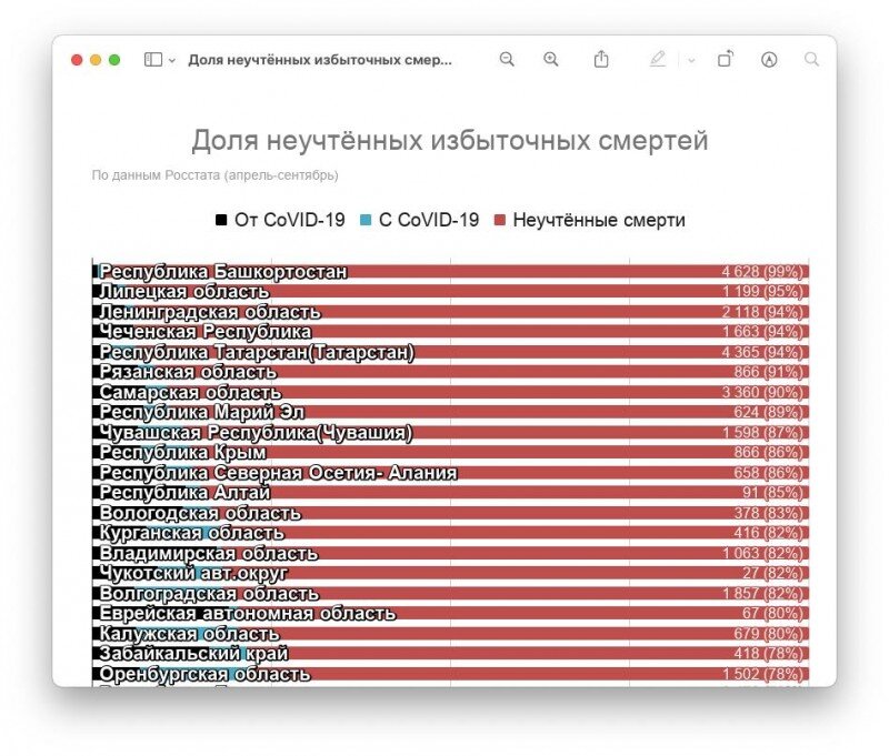 Есть прилежные регионы типа Москвы, Петербурга или Алтайского края, где доля неучтённых избыточных смертей не превышает 25%. Ну то есть основная часть так или иначе учтена как ковидная, а кто-то ещё умер от последствий эпидемии в целом. Таких регионов по состоянию на сентябрь было... СЕМЬ. Ещё десять регионов записывают в ковидных более половины избыточных смертей.