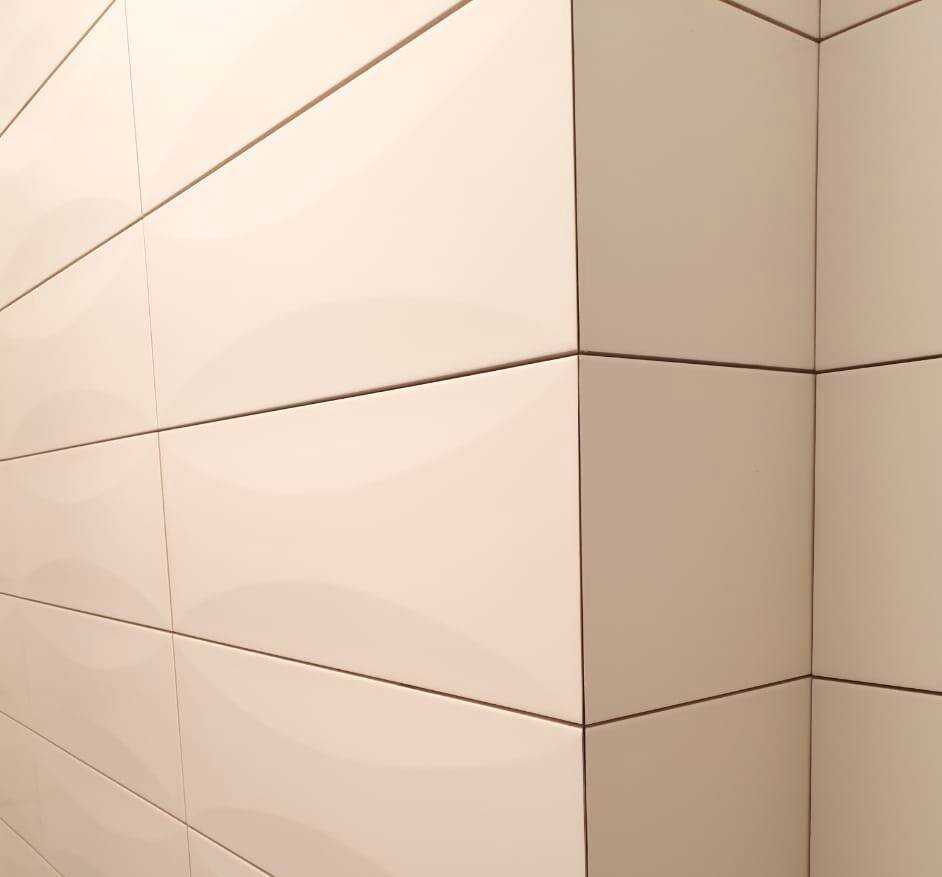 Края двух плиток, которые должны образовать прямой угол, подрезаются под углом 45°. Если поверхности, подготовленные к облицовке, хорошо выровнены, а обрезка проведена аккуратно, то кромки плиток сходятся практически идеально, образуя малозаметный шов.