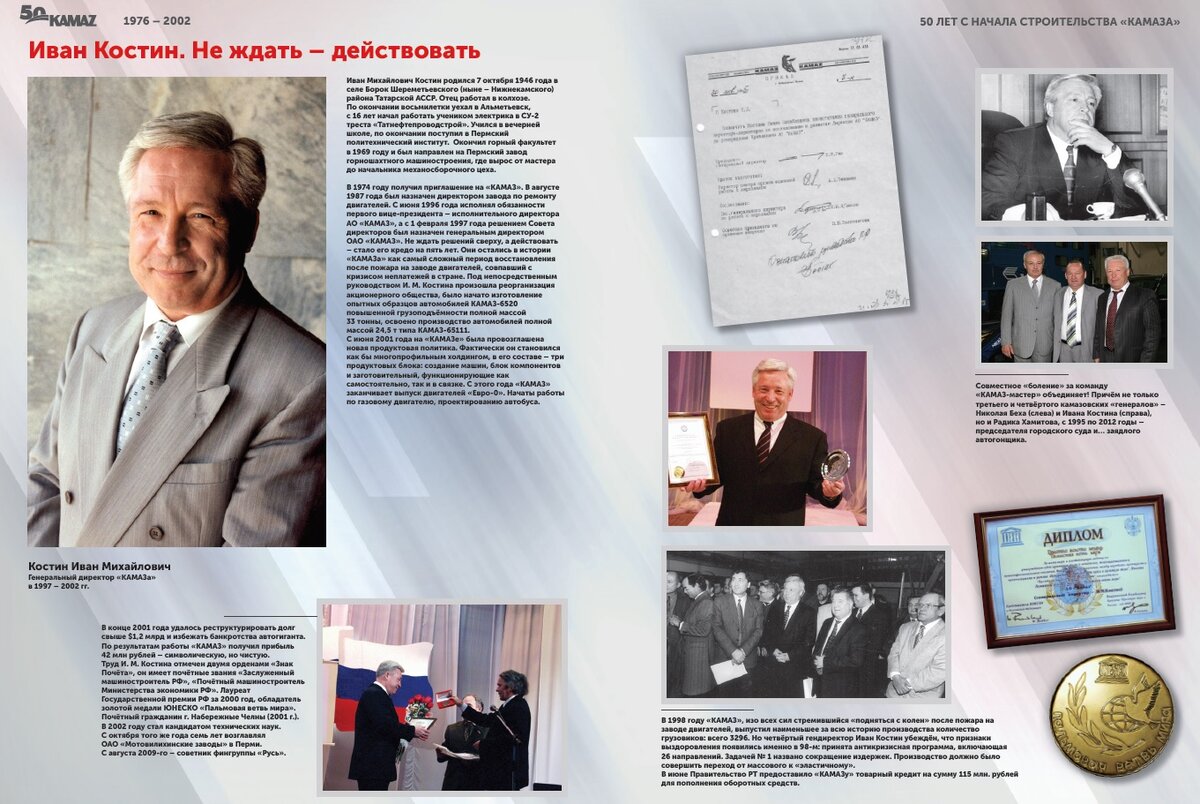 Этот пост посвящён Ивану Костину, занимавшему пост генерального директора Камского автогиганта в период с 1997-го по 2002-й годы. Иван Михайлович Костин родился 7 октября 1946 года в селе Борок Шереметьевского (ныне – Нижнекамского) района Татарской АССР. Отец работал в колхозе. По окончании восьмилетки уехал в Альметьевск, с 16 лет начал работать учеником электрика в СУ-2 треста «Татнефтепроводстрой». Учился в вечерней школе, после получения аттестата продолжил своё образование, поступив в Пермский политех. Окончил горный факультет в 1969-м, после чего по направлению устроился на Пермский завод горношахтного машиностроения, где вырос от мастера до начальника механосборочного цеха. В 1974 году получил приглашение на «КАМАЗ». В августе 1987-го был назначен руководителем на завод по ремонту двигателей. С июня 1996 года исполнял обязанности первого вице-президента – исполнительного директора АО «КАМАЗ», а с 1 февраля 1997 года решением Совета директоров был назначен генеральным директором