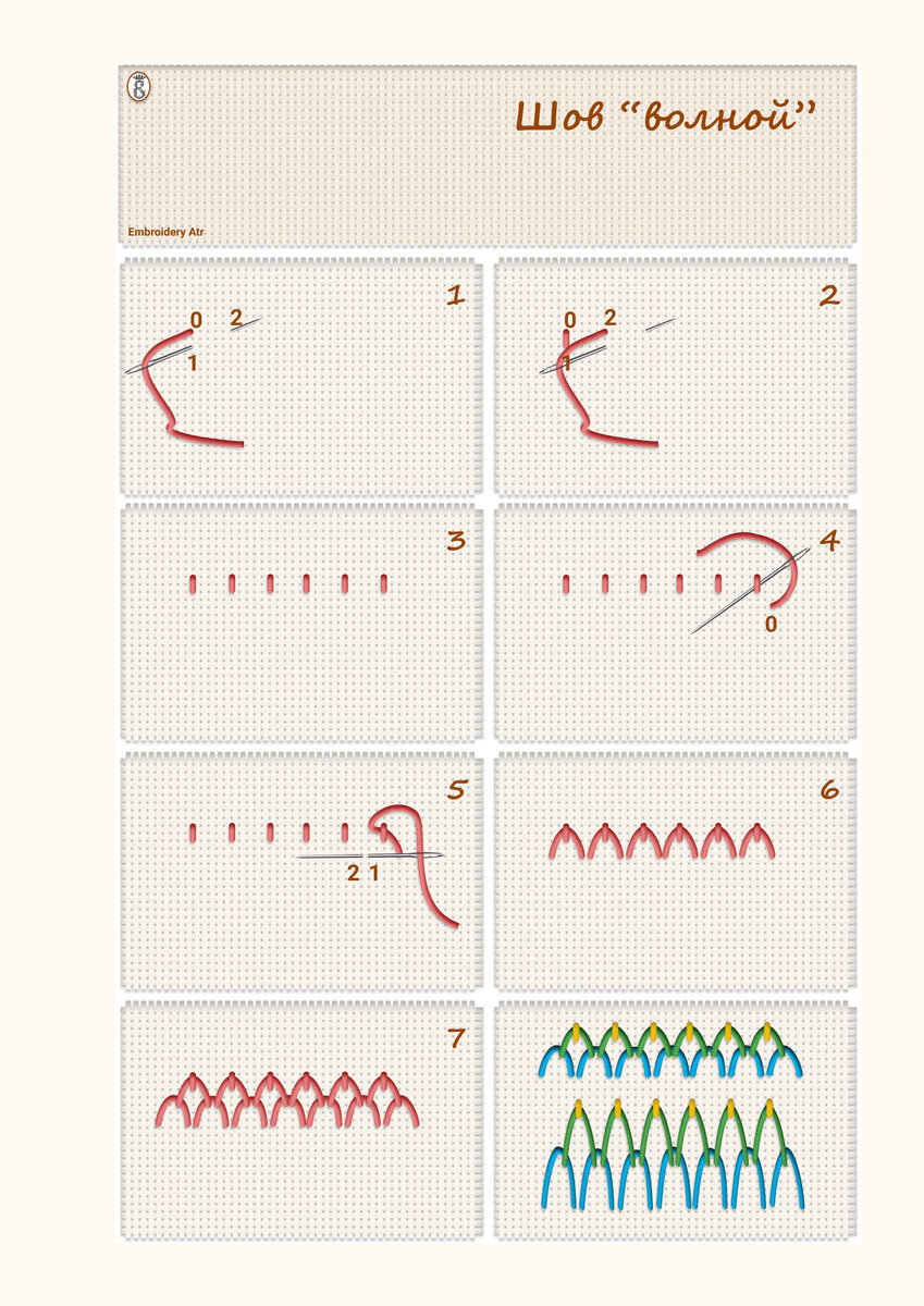 Шов " волной" - заполняющий шов. Им можно закрывать большие пространства: имитируя траву, стены. Используя для каждого ряда нити разных цветов можно создать градиентные заливки или радужные переходы.