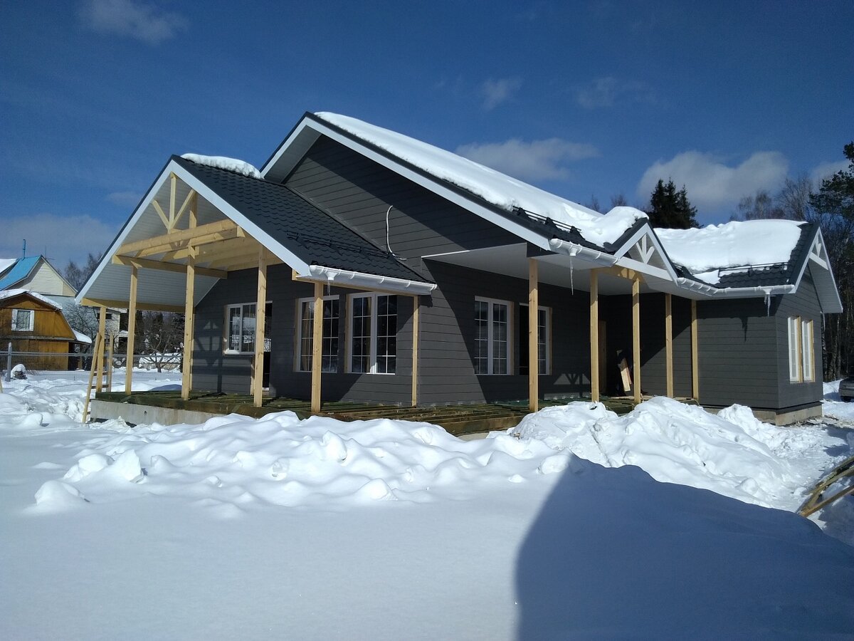 Крыша - Металлочерепица «мокрый асфальт», точное попадание в тон фасада. Дом каркасный по технологии «перекрестного утепления» 200 мм толщиной на ленточном фундаменте. Крепкий надежный солидный вариант для тех, кто ищет уединения в загородном просторе.