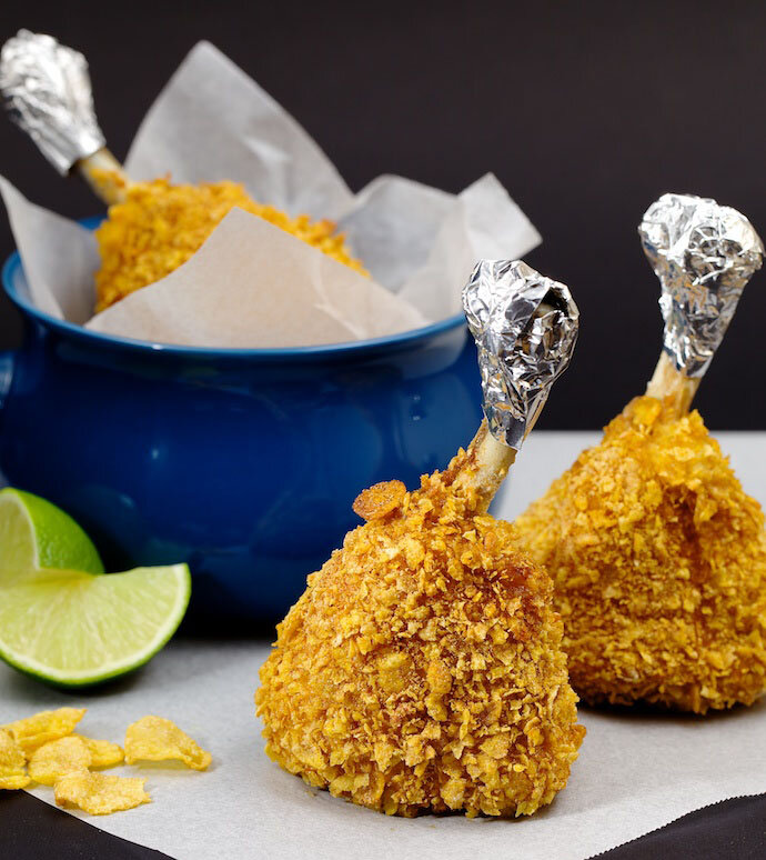 Ха-ха! Стряхните излишки муки и окуните куриную ножку в яйцо, а затем в кукурузные хлопья.