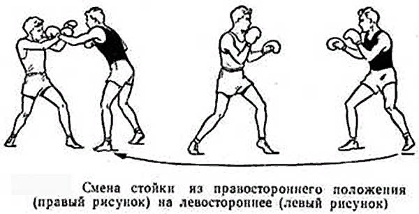 стойки. Смену стойки, когда меняется передняя нога и сильнейшая рука и т.п., например при переходе из правосторонней в левостороннюю, и наоборот лучше делать во время перерыва или остановки боя,для того чтобы мозг вместе со стойкой смог перестроится,так как в разных стойках голова работает по разному.