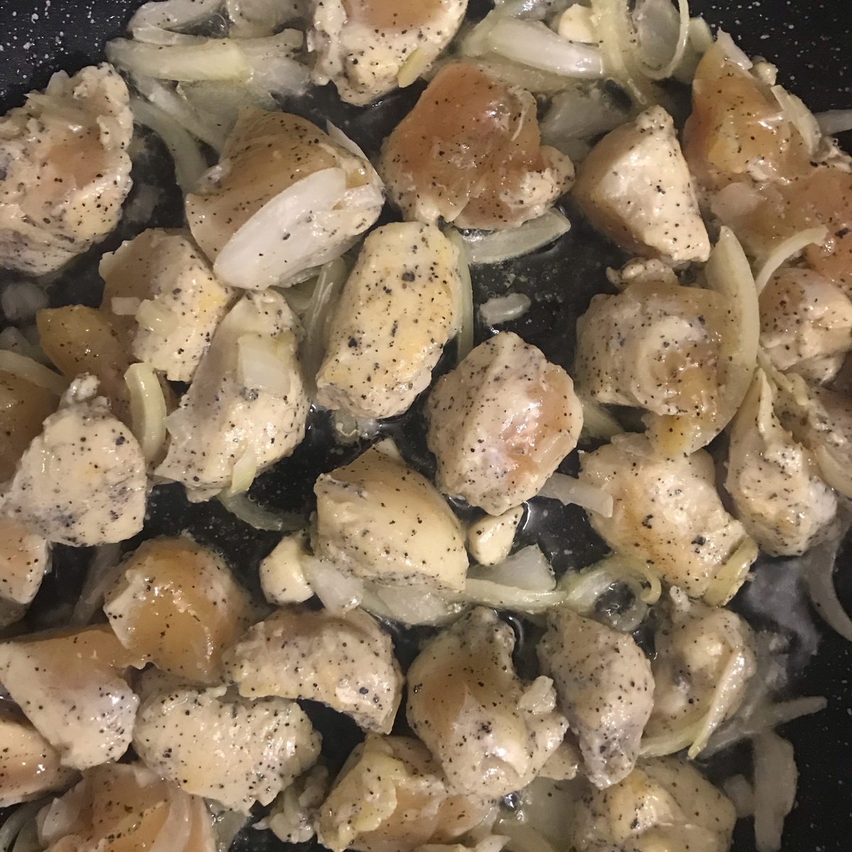 Курицу нужно мелко порезать и обжарить на сковороде, посолив и поперчив по вкусу. У меня куриная грудка предварительно мариновалась в луке.