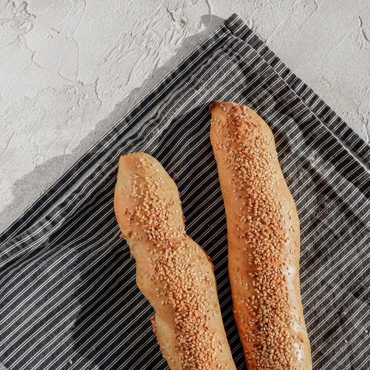 ⑥ Присыпаем каждый багет солью (можно добавить мелко молотый перец), а также кунжутом; духовка должна быть разогрета до 220-240С; на нижний уровень ставим решетку с формой или жаропрочной миской, наливаем в нее кипяток, ставим в середину духовки противень с багетами и выпекаем минут 10.