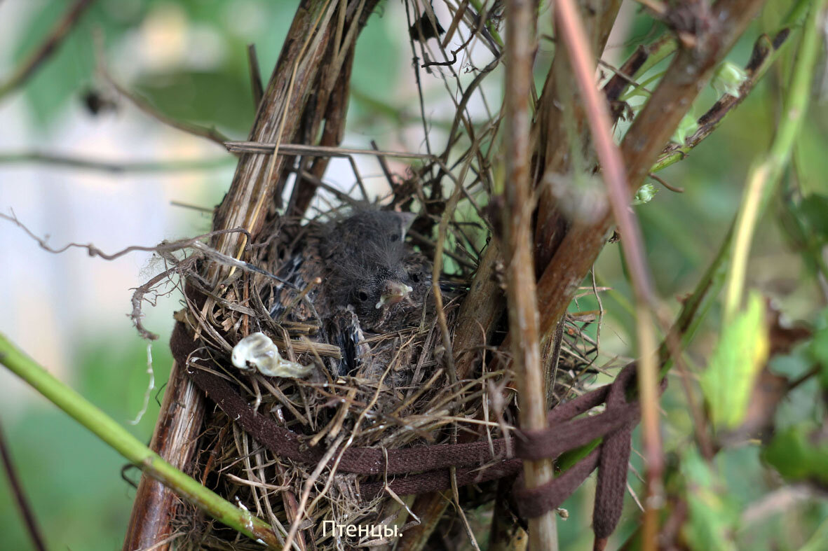 В тот же день я заметил, что гнездо сползает и может совсем упасть на землю. Взял тесёмку, подполз и связал прутья малины. Целый месяц, а может больше, мы с женой дверью крыльца не хлопали, говорили шепотом и ходили на цыпочках. Пичуга к нам привыкла и не боялась. Вывелись пять птенчиков. Три птенца погибли. Ничего не поделаешь - естественный отбор.