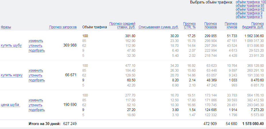 Чтобы спланировать бюджет рекламной кампании, можно обратиться к Прогнозу бюджета. Этот инструмент позволяет спрогнозировать бюджет, количество запросов и кликов, среднюю ставку, показы, CTR и примерные цены для каждой ключевой фразы в нужных регионах в конкретный период. Ставки и цены в Прогнозе бюджета могут отличаться от реальных в большую и меньшую сторону, так как все аукционы проходят только в режиме реального времени, и их результаты невозможно точно предугадать.