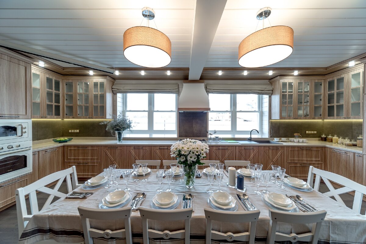 Кухонный гарнитур с необходимой техникой, рабочая столешница длиной восемь метров, длинный обеденный стол и удобные стулья точно понравятся семье, где два взрослых и шестеро детей. Отдохнуть позволят уютные диванные уголки, а спрятать вещи – сундуки и шкаф в прихожей.